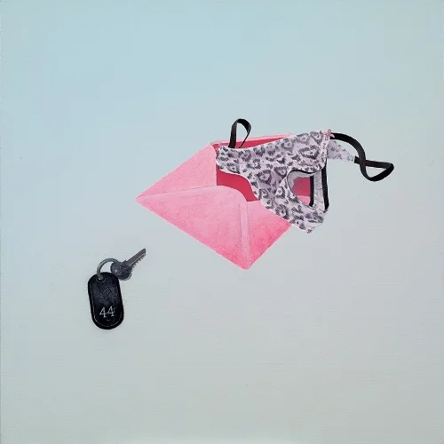 Room key/dropped thong/money envelope on a background derived from the blue/brown of the visiting work to the blue/grey of mine.